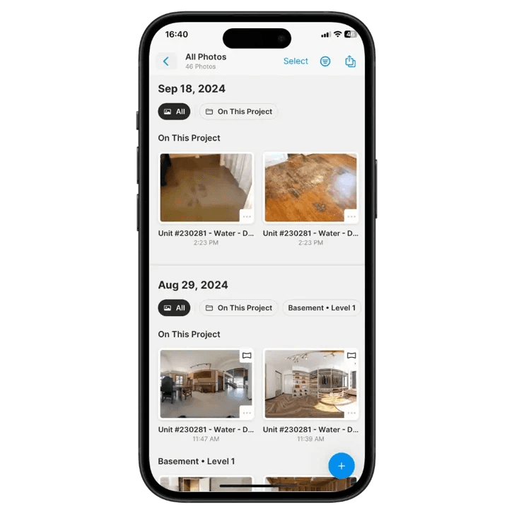 Once you have all your photos for the project in magicplan, you can jump into the photo gallery to get a clear view of the progress timeline. You can organize photos by date, rooms, and even subgroup them to create a clean, easy-to-follow story of the job. This makes it a lot simpler to see how the project unfolded from start to finish.