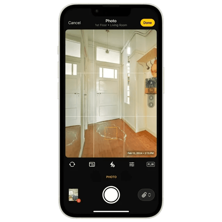If you’re using magicplan, you can snap photos while scanning the room. The Auto-Scan feature on LiDAR enabled devices pins the photos right on the sketch where you took them, so later, you’ll know exactly where everything went down. If you forget to take a photo during the scan, no big deal—you can add it afterward by dropping it right on the spot in the sketch. This way, your estimator or anyone else on the job knows exactly what’s up and where.