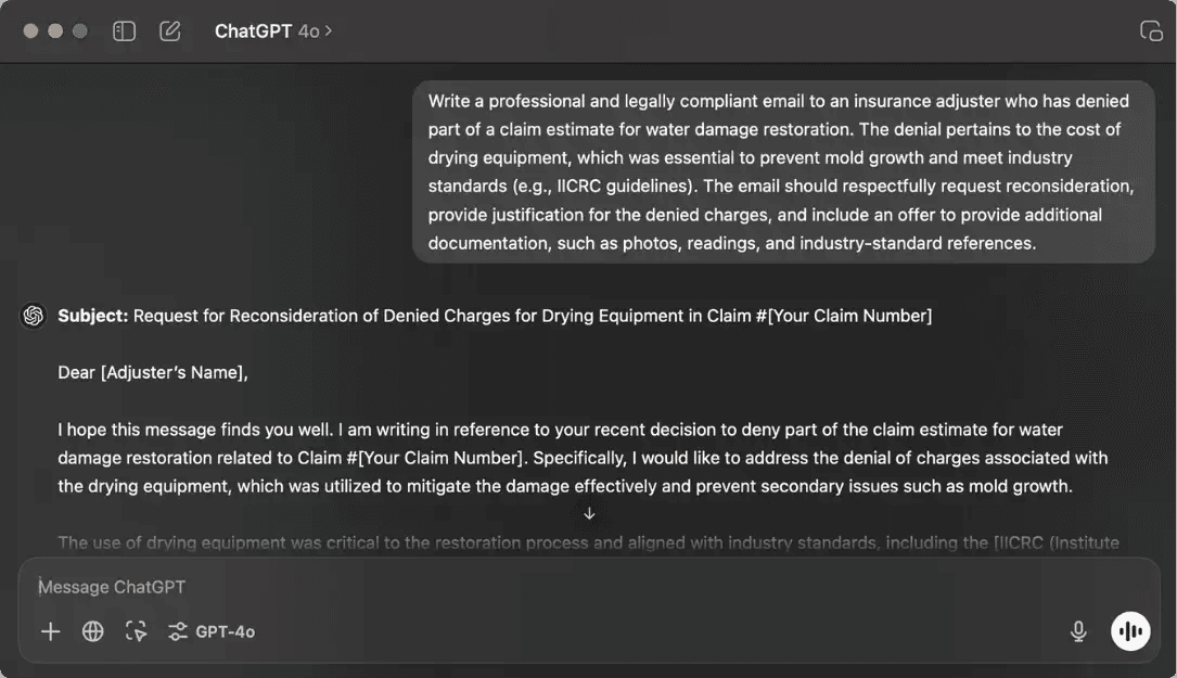 Generating Insurance Correspondence: Filing claims and dealing with insurance companies can be time-consuming. AI tools can help draft professional and legally compliant correspondence for adjusters or clients, ensuring that all necessary details are included and properly formatted.