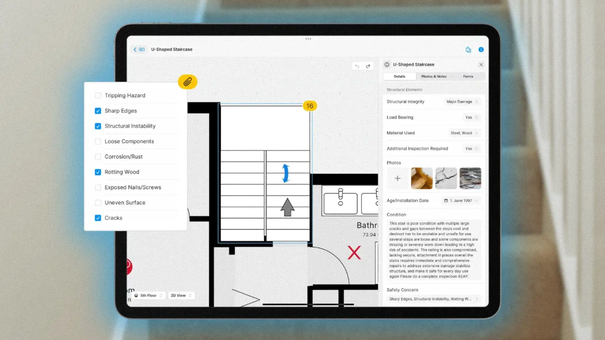 ✓ Comprehensive Content: Allows users to collect critical details with custom site-assessment forms, easily label and caption photos, and modify sketches with instrument readings, observational notes, and directives for restoration work.