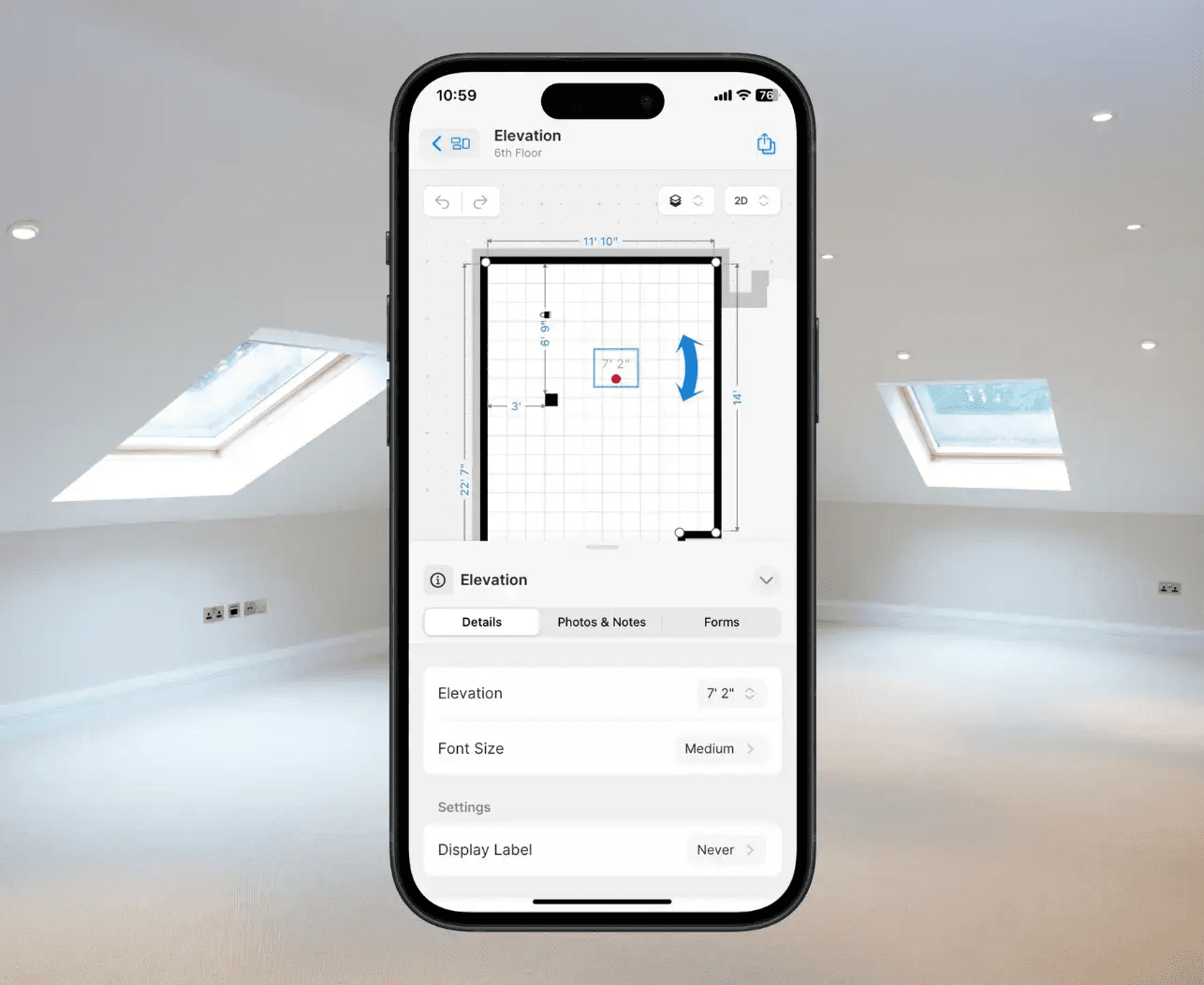 3. Définissez les hauteurs et les positions : Ajustez les hauteurs et les positions de l'objet “Élévation” pour qu'elles correspondent à votre plafond en pente. Vous pouvez saisir ces valeurs manuellement ou les ajuster visuellement dans l'application.